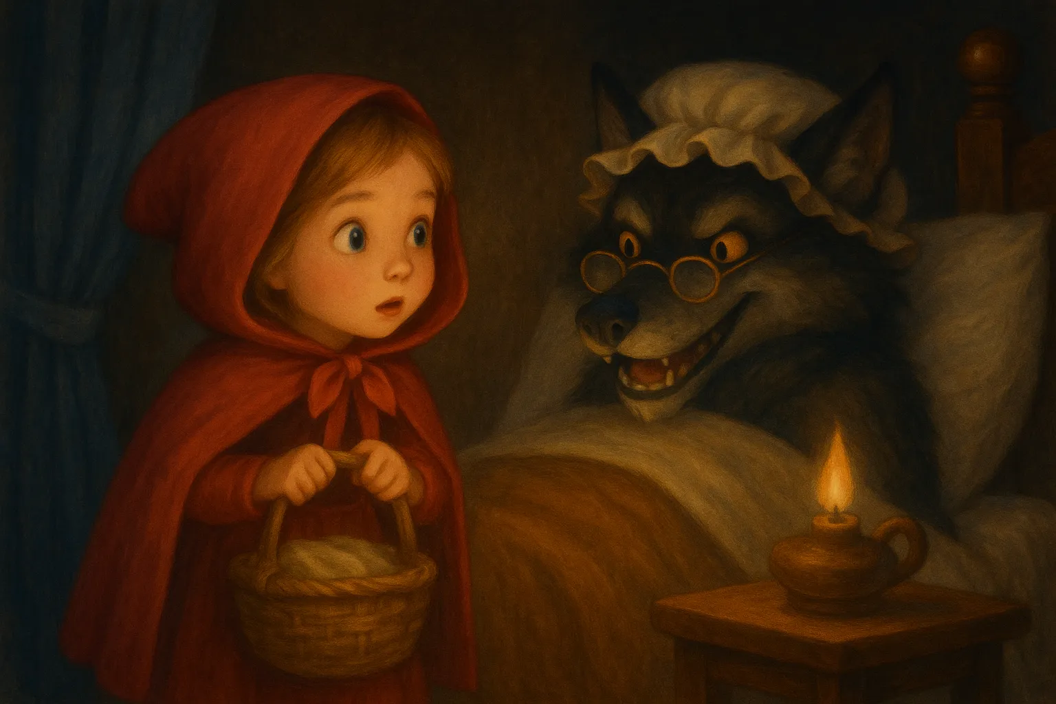 Η γιαγιά κατάλαβε πως κάτι δεν πήγαινε καλά, αλλά δεν πρόλαβε να αντιδράσει. Ο λύκος μπήκε μέσα, την έκλεισε σε μια μεγάλη ντουλάπα και φόρεσε τα ρούχα της.