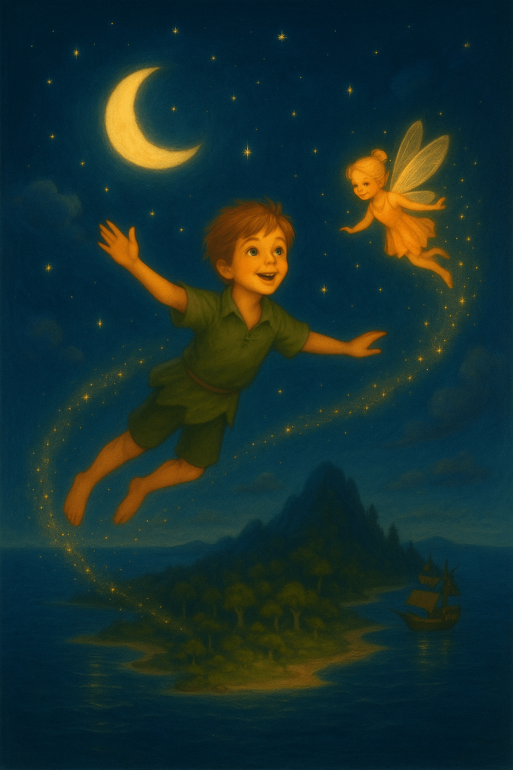 ✈️ Μια φορά κι έναν καιρό, σ’ έναν δρόμο γεμάτο πολυκατοικίες και αυτοκίνητα που κορνάριζαν, ζούσε ο μικρός Πίτερ. Ήταν ένα αγόρι γεμάτο φαντασία, που δεν ήθελε να μεγαλώσει. Έφτιαχνε πλοία με μαξιλάρια, πετούσε με σεντόνια και μιλούσε με σκιές.