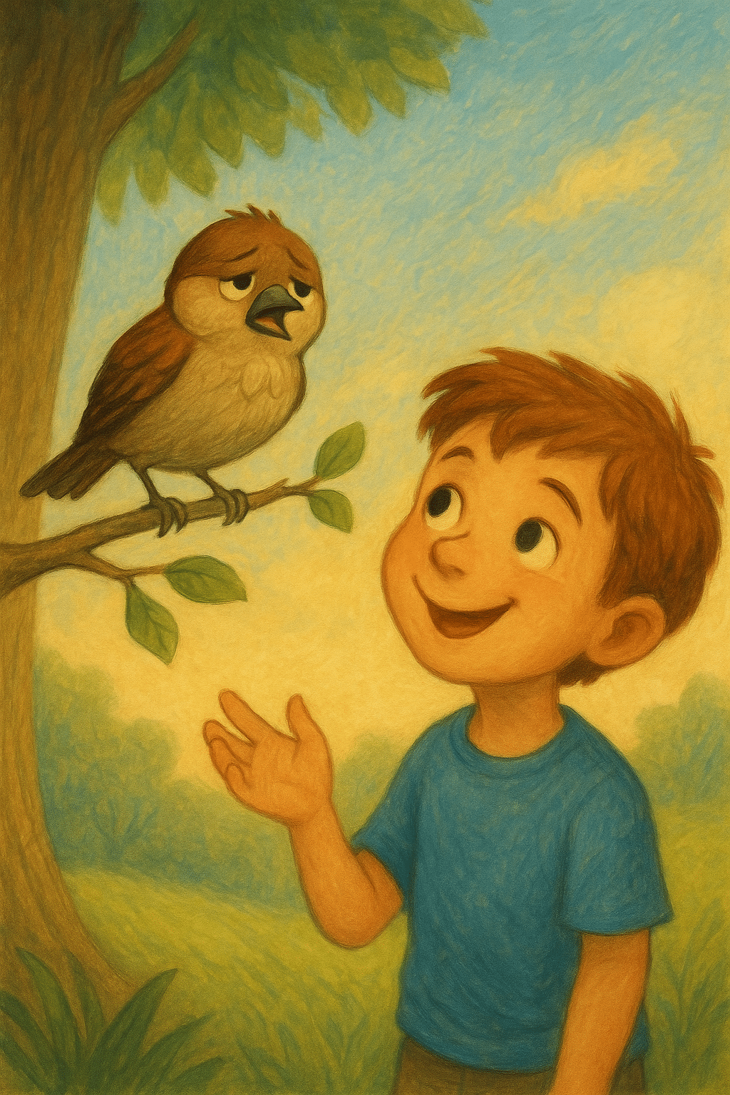 ♦ Ένα απόγευμα, την ώρα που ο ήλιος έδυε, το σπουργίτι είδε ένα παιδί να κάθεται κάτω από ένα δέντρο. Το παιδί ήταν λυπημένο. Τότε, χωρίς να το σκεφτεί πολύ, το σπουργίτι άρχισε να κελαηδά με τη δική του φωνή: σύντομη, ζωηρή, γεμάτη χαρά και ενέργεια.