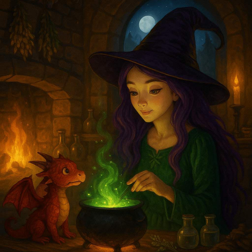 🧪 Μια φορά και έναν καιρό σε μια χώρα μακρινή, κρυμμένη ανάμεσα σε σύννεφα λεβάντας και ποτάμια που ψιθύριζαν τραγούδια, ζούσε μια μάγισσα, η Λίλα, που αγαπούσε να φτιάχνει μαγικά φίλτρα.