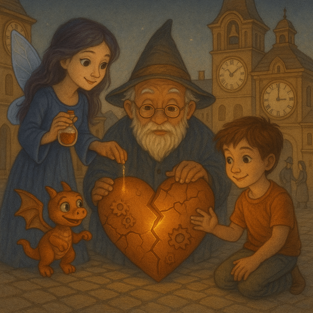 Στην Πολιτεία, όλα ήταν ακίνητα. Οι άνθρωποι περπατούσαν σιωπηλοί, χωρίς χαμόγελα. Στο κέντρο ζούσε ο Φύλακας του Χρόνου. Κρατούσε τη ραγισμένη Καρδιά του Χρόνου.