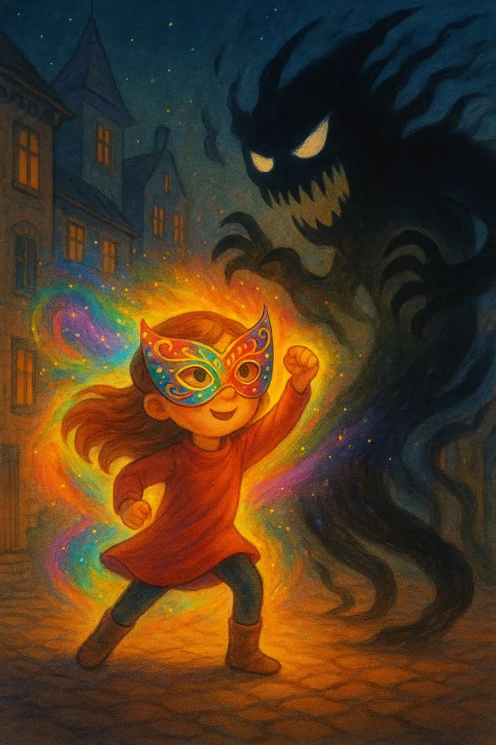 Ένα βράδυ, όταν το φεγγάρι έλαμπε περίεργα κόκκινο, βρήκε στο περβάζι του παραθύρου της μια μικρή, λαμπερή μάσκα. Ήταν φτιαγμένη από χίλια χρώματα που άλλαζαν συνέχεια, σαν ουράνιο τόξο ζωντανό.