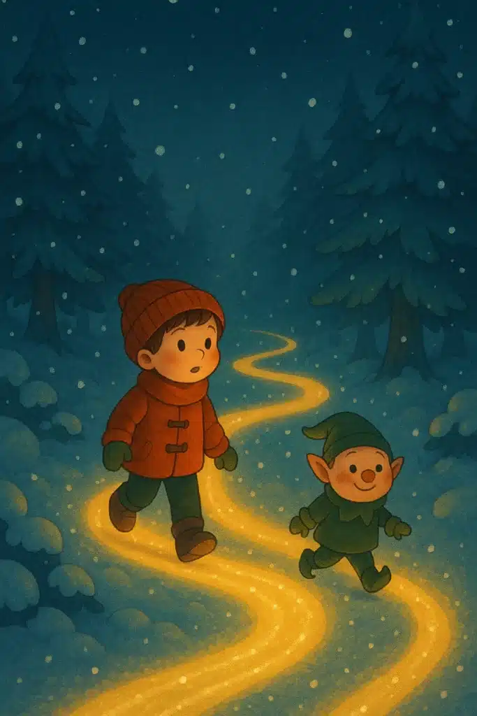 🎄 Ο Μάριος και ο Πίκο περπατούσαν σε ένα μονοπάτι που έλαμπε σαν χριστουγεννιάτικη κορδέλα. Οι νιφάδες που έπεφταν δεν έκαναν θόρυβο, και ο αέρας ήταν γεμάτος από έναν περίεργο… ψίθυρο.
