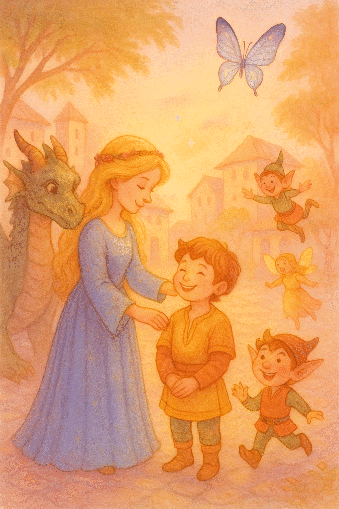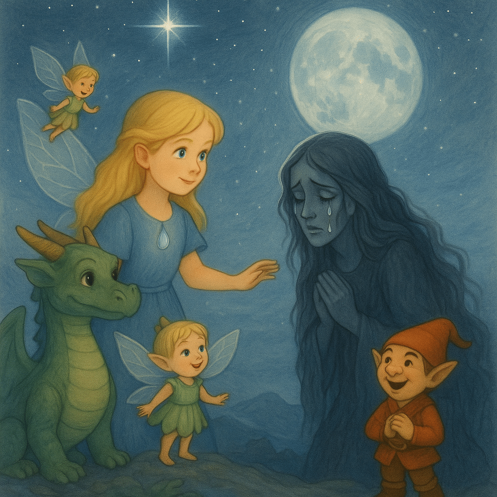 Η Νερέλια ξεκίνησε το ταξίδι της με οδηγό έναν μαγικό χάρτη φτιαγμένο από αστέρια. Πέρασε μέσα από το Δάσος των Σιωπών, όπου τα δέντρα ψιθύριζαν αρχαία τραγούδια. Εκεί συνάντησε έναν λυπημένο δράκο που είχε χάσει τη φωνή του. Αντί να φοβηθεί, του έδωσε μια αγκαλιά. Τότε εκείνος βρήκε ξανά τη φωνή του και της χάρισε ένα μπουκαλάκι με φίλτρο ελπίδας.