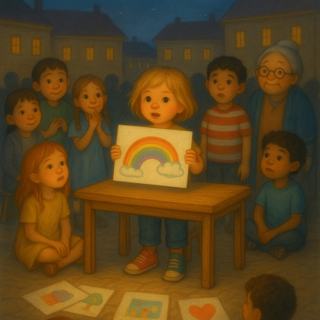 🏛️ Την επόμενη μέρα, στην πλατεία της πόλης, στήθηκε ένα ξύλινο τραπέζι. Αντί για κριτές, υπήρχαν μαξιλάρια για να καθίσουν τα παιδιά. Κι αντί για νόμους, υπήρχαν όνειρα ζωγραφισμένα σε χαρτί.