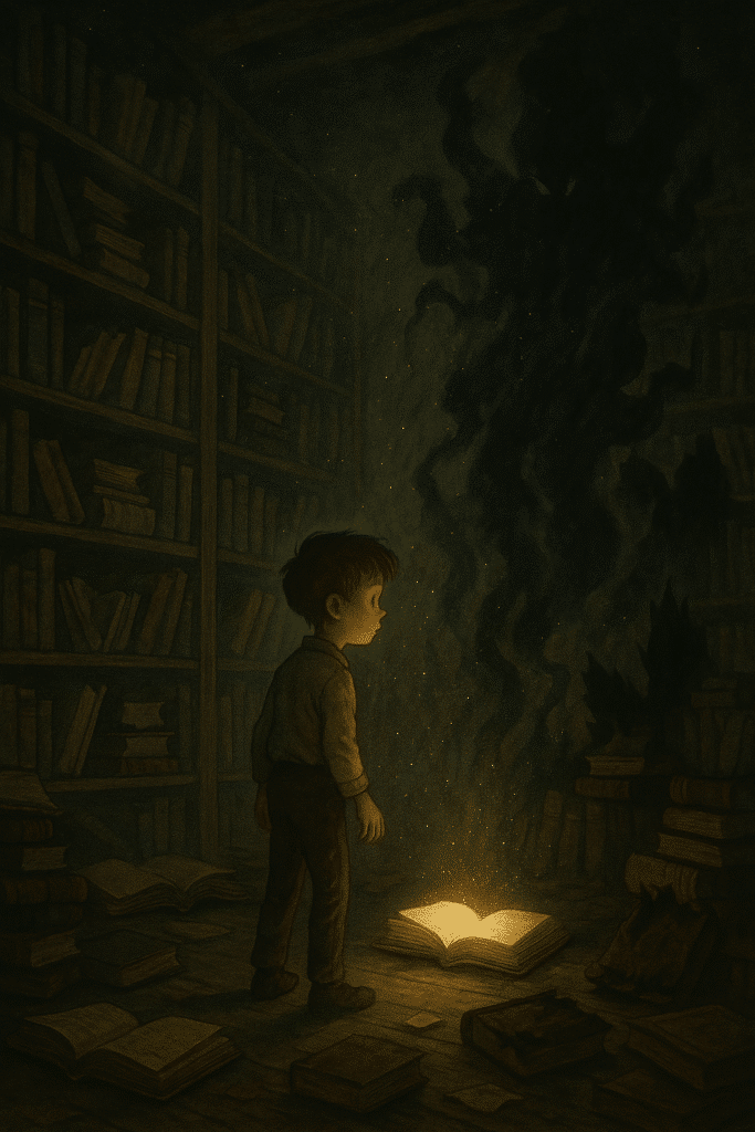 ✦ Μέσα, η σκόνη χόρευε σαν αστέρια σε αόρατο αέρα. Τα βιβλία, αραδιασμένα παντού. Μερικά ανοιχτά, μερικά μισοκαμένα και μερικά… ψιθύριζαν.
