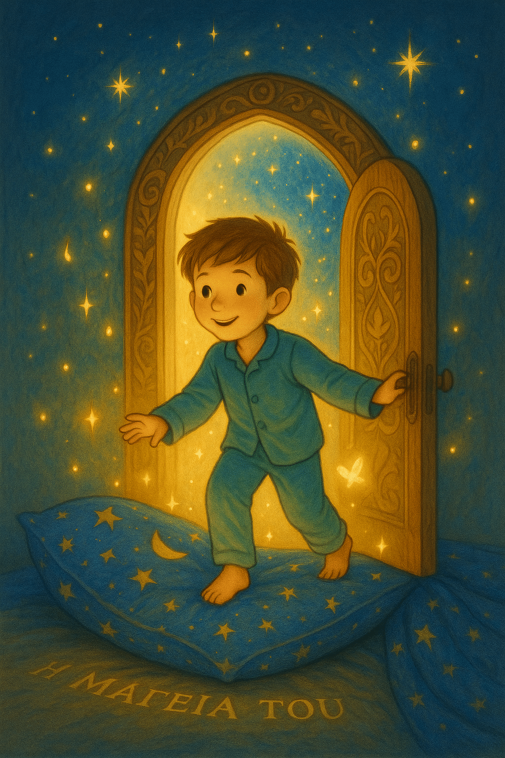 ✦ Ένα βράδυ με φουρτουνιασμένο φεγγάρι και αστέρια που έτρεμαν, ένιωσε κάτι περίεργο. Το μαξιλάρι του ήταν… βαθύτερο. Έσκυψε και βρήκε κάτι που δεν υπήρχε ποτέ πριν: μια μικρή, κρυστάλλινη πόρτα. Τη χτύπησε ελαφρά, και αυτή άνοιξε με έναν ψίθυρο: