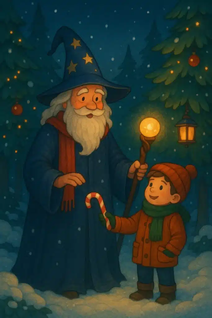 🎄 Κι εκεί στεκόταν ο μάγος Λουμινόρ, ένας καλοσυνάτος γέροντας με μακρύ μανδύα και ένα καπέλο που είχε πάνω του περισσότερα αστέρια κι από τον χειμωνιάτικο ουρανό. Στο χέρι του κρατούσε ένα ραβδί που έλαμπε σαν χριστουγεννιάτικη μπάλα.