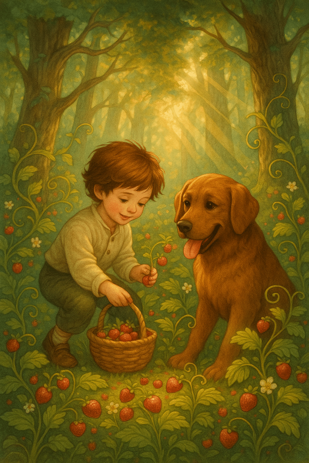 «Σήμερα θα πάμε στο Μεγάλο Δάσος, να βρούμε φράουλες!» Ο Μπρούνο κούνησε χαρούμενα την ουρά του και πήδηξε πάνω του, γεμίζοντας τον με φιλιά.