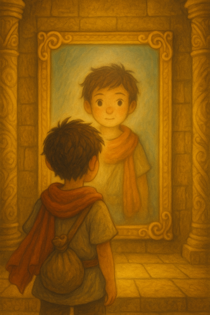 🏰 Στο τέλος του ταξιδιού, έφτασε σε έναν αρχαίο ναό, με τοίχους που έλαμπαν σαν χρυσάφι. Στην καρδιά του ναού υπήρχε ένας μεγάλος καθρέφτης.