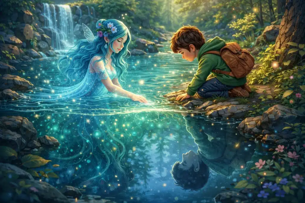 ♦ Ξαφνικά το νερό άρχισε να κινείται και από μέσα του εμφανίστηκε μια μικρή νεράιδα του ποταμού.