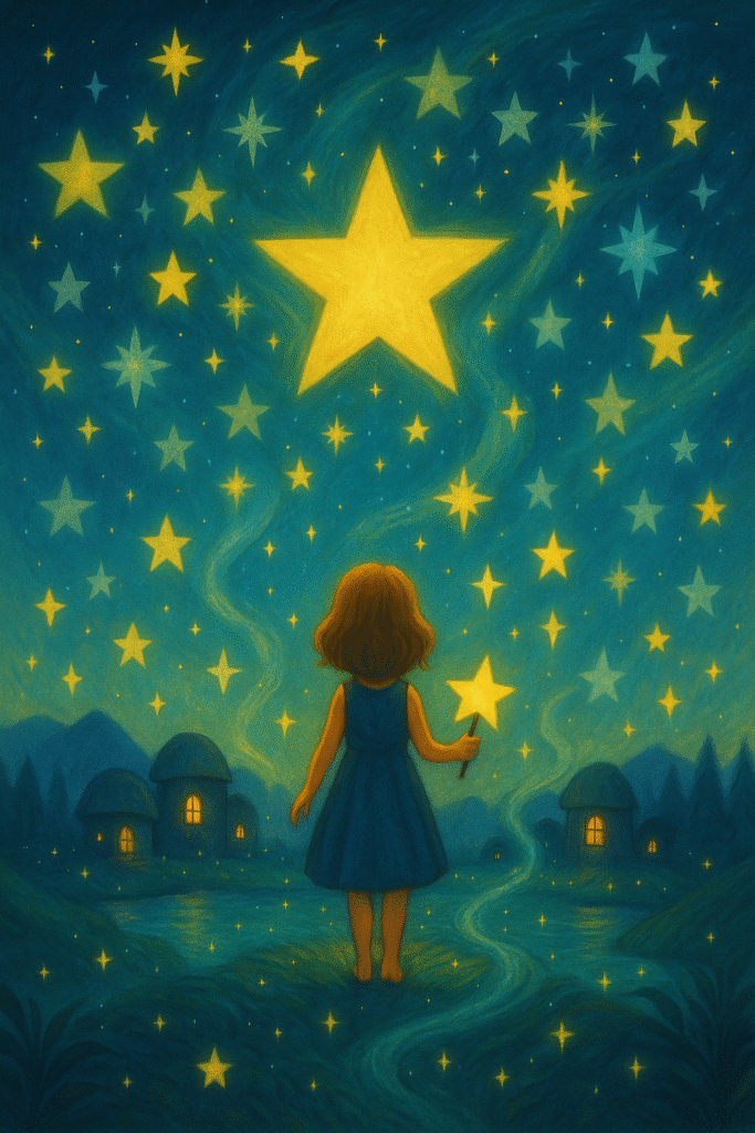 «Καλωσόρισες στον Ουρανό των Αστεριών!» είπε με χαμόγελο. «Εδώ η φαντασία σου ζωντανεύει. Ό,τι σκεφτείς με την καρδιά σου μπορεί να γίνει πραγματικότητα.»